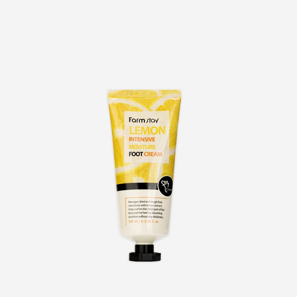 Farmstay Lemon Intensive Moisture Foot Cream is a hydrating and nourishing foot cream that helps to soothe and moisturize dry and rough feet. The cream is enriched with natural ingredients that help to exfoliate dead skin cells, soften calluses, and reduce the appearance of fine lines and wrinkles on the feet. It has a refreshing lemon scent that helps to invigorate the senses and leave the feet feeling fresh and revitalized.The cream has a thick and creamy texture that spreads easily and absorbs quickly into the skin, leaving no greasy residue behind. It is formulated with a blend of natural oils, including olive oil, avocado oil, and shea butter, which help to provide deep hydration and nourishment to the skin. It also contains lemon extract, which is known for its antibacterial and antifungal properties, helping to keep the feet healthy and free from infections.